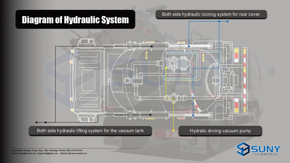It's equipped with suction tanker, vacuum pump, hydraulic system and other pneumatic components which could fulfill different requirements of specific operations.