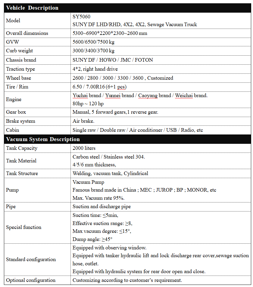 Vacuum sewage suction truck is designed special purposed truck which used to collect, transport and discharge liquid such as dirty water, sludge, septic, crude oil, and solid stuff such as small stones, bricks as well.