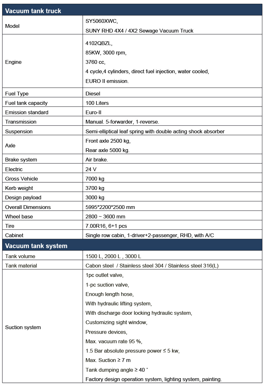 Vacuum sewage suction truck is designed special purposed truck which used to collect, transport and discharge liquid such as dirty water, sludge, septic, crude oil, and solid stuff such as small stones, bricks as well.