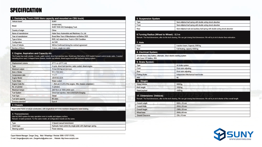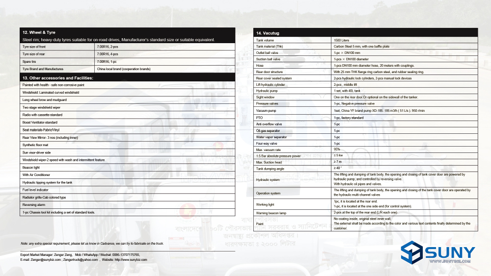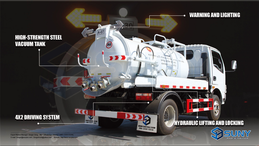 Vacuum sewage suction truck is designed special purposed truck which used to collect, transport and discharge liquid such as dirty water, sludge, septic, crude oil, and solid stuff such as small stones, bricks as well.