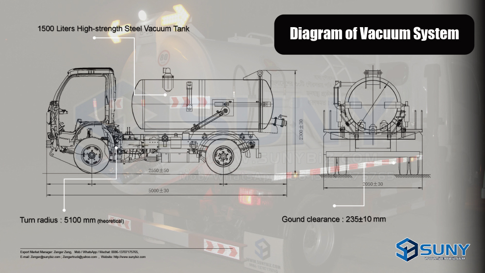 It's equipped with suction tanker, vacuum pump, hydraulic system and other pneumatic components which could fulfill different requirements of specific operations.