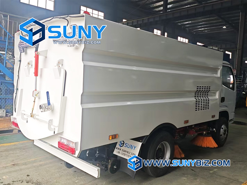 Road sweeping truck is equipped with 4 brushes, water spray nozzle and rear vacuum suction nozzle, water tanker and sewage tanker which could clean the street and suppression dust at same time. The 4 brushes sweep the garbage together, which for the vacuum suction nozzle collecting. The water spray nozzle is equipped for dust elimination, preventing re-pollution.